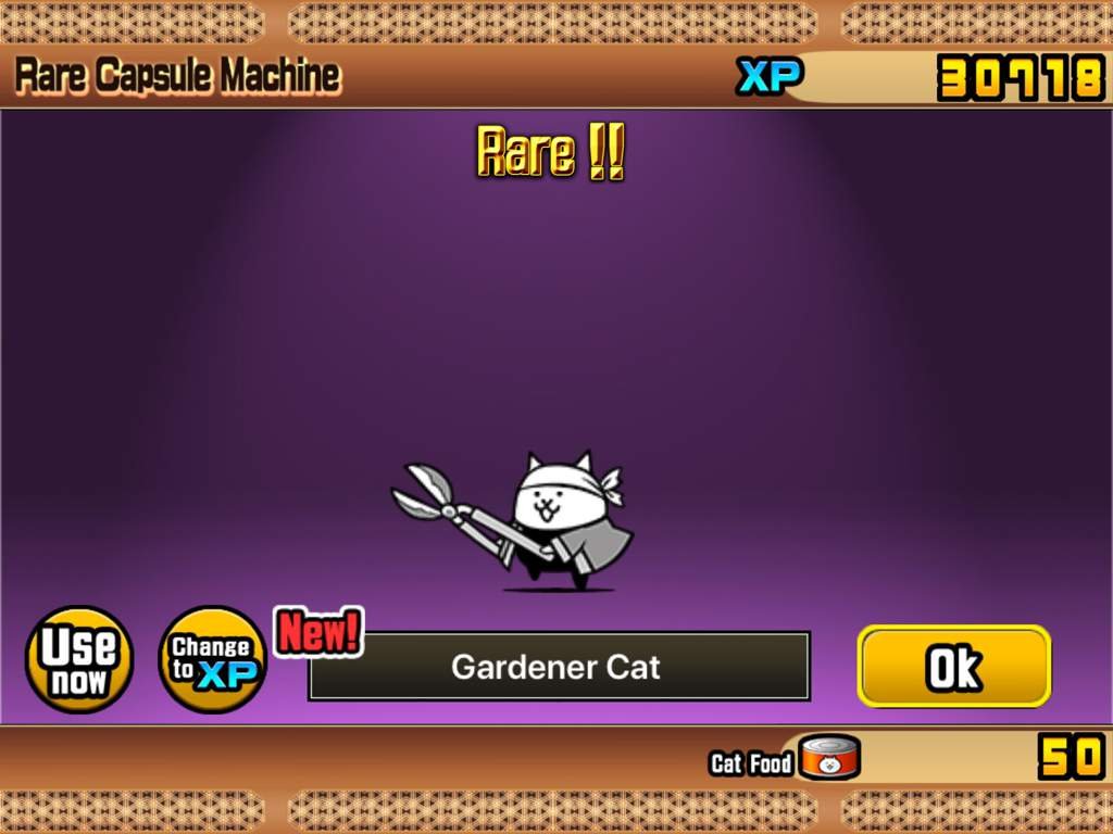 Gardener Cat is a Rare Cat that can be unlocked by playing the Rare Cat Capsule. For super rares sushi cat and face cat are very strong against reds. Evolves into Heavyweight Cat at level 10.